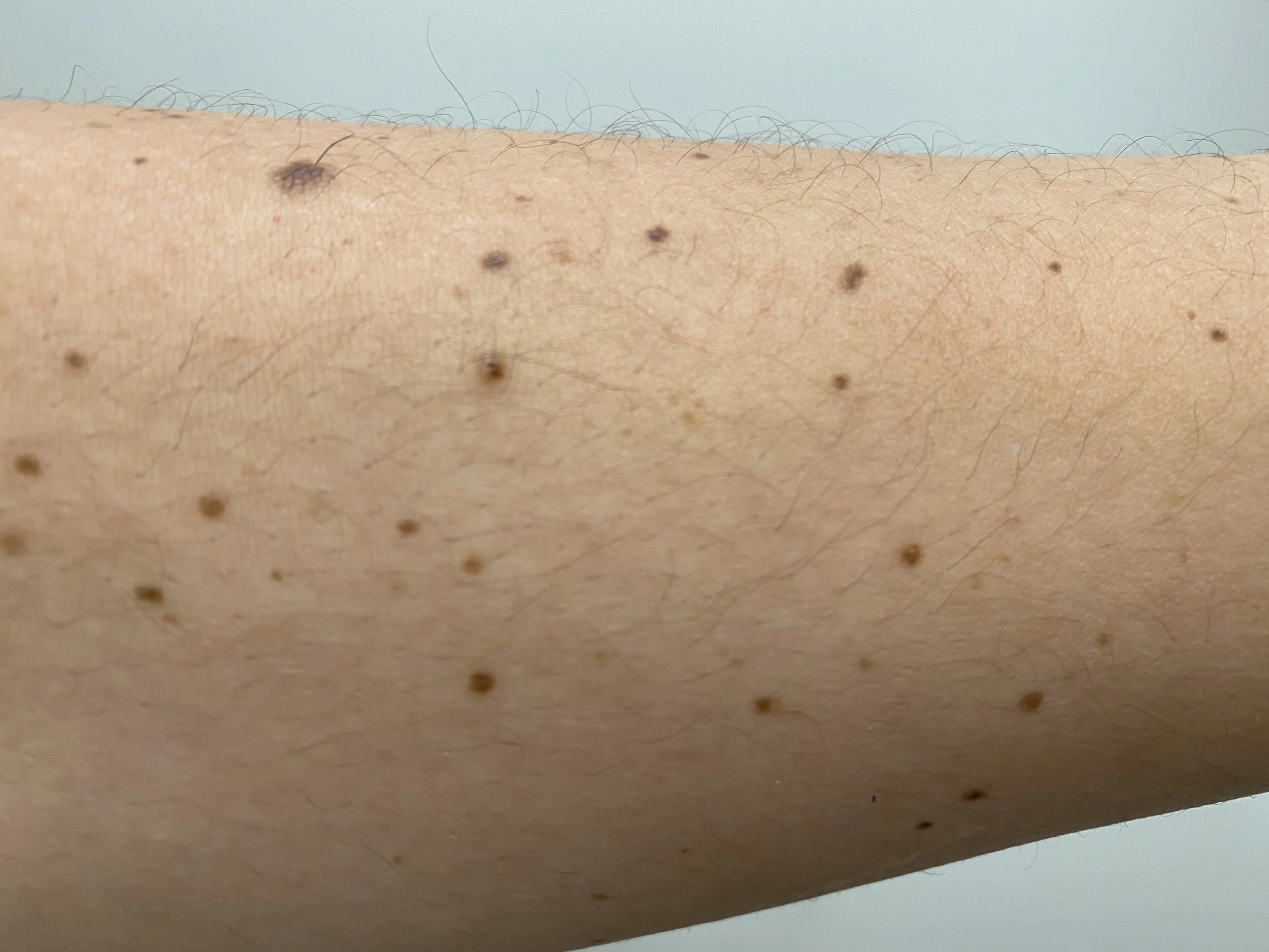 Moles (nevi) are a common type of skin growth. They often appear as small, dark brown spots and are caused by clusters of pigmented cells. Moles generally appear during childhood and adolescence. Most people have 10 to 40 moles, some of which may change in appearance or fade away over time.